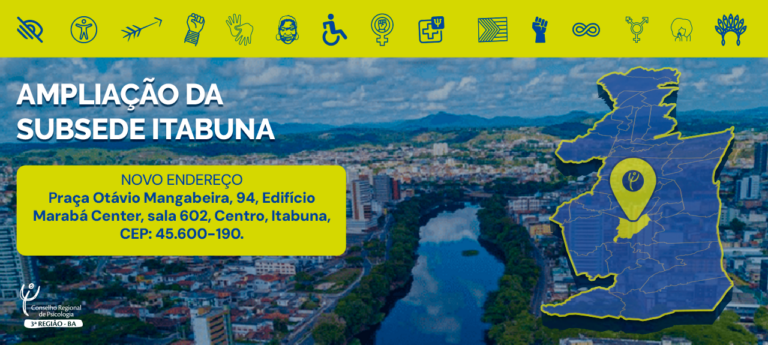 O Conselho Regional de Psicologia da Bahia (CRP-03) informa que a Subsede Santa Cruz localizada em Itabuna mudou de endereço. O novo local de atendimento fica agora na Praça Otávio Mangabeira, 94, Edifício Marabá Center, sala 602, Centro, Itabuna, CEP: 45.600-190.