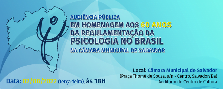 Dando seguimento às celebrações pelas seis décadas de regulamentação da profissão de psicóloga/o, o Conselho Regional de Psicologia da Bahia (CRP-03) convida toda a categoria e estudantes para participar da Audiência Pública em homenagem aos 60 anos da regulamentação da Psicologia no Brasil, na Câmara Municipal de Salvador.