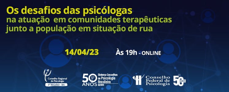 Com o propósito de debater sobre a atuação e papel das psicólogas/os nos diferentes contextos das comunidades terapêuticas junto a pessoas em situação de rua, a Comissão de Políticas Públicas (CPP) do Conselho Regional de Psicologia da Bahia (CRP-03) promoverá o seminário online com o tema “Os desafios das/os psicólogas/os frente a efetividade das comunidades terapêuticas junto a população em situação de rua”. O evento será realizado no dia 14 de abril, às 19h, com transmissão ao vivo no Youtube do CRP-03. As inscrições são gratuitas e estão abertas na plataforma Doity. (CLIQUE AQUI)