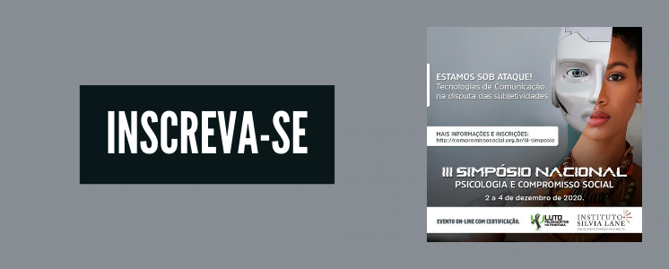 Estão abertas as inscrições para o III Simpósio Nacional Psicologia e Compromisso Social, a ser realizado de 02 a 04 de dezembro de 2020. Com o tema “ESTAMOS SOB ATAQUE – Tecnologias de comunicação na disputa das subjetividades!”, o evento será 100% on-line e gratuito. As atividades acontecerão na parte da manhã dos 3 dias. Inscrições em: http://compromissosocial.org.br/iii-simposio