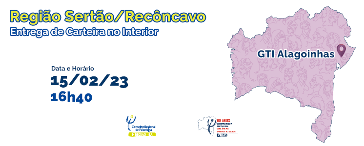 No dia 15 de fevereiro, o CRP-03, por meio da Comissão de Interiorização (COMINTER), realizará uma entrega de Carteira de Identidade Profissional (CIP) na cidade de Alagoinhas. A atividade inicia às 16h45, na clínica da Faculdade Santíssimo Sacramento, localizada na Rua Parque José Dórea, nº 39, 4ª travessa, centro.