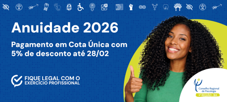 O Conselho Regional de Psicologia da Bahia (CRP-03) lembra às psicólogas e aos psicólogos da Bahia que o prazo para pagamento da Anuidade 2026 em cota única, com 5% de desconto, segue válido até o dia 28 de fevereiro.