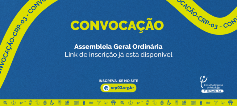 O Conselho Regional de Psicologia (CRP-03) disponibiliza o link de inscrição para Assembleia Geral Ordinária, que acontece no dia 30 de agosto, sábado, com primeira chamada às 9h e segunda chamada às 9h30, conforme edital de convocação. A assembleia tem como pauta a aprovação do valor da anuidade, taxas e emolumentos para o exercício de 2026. A reunião será realizada de modo online, em plataforma específica para votação.