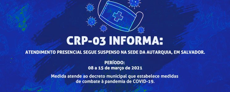 O Conselho Regional de Psicologia da Bahia (CRP-03) informa que o atendimento presencial segue suspenso na sede da autarquia, em Salvador, até 15 de março de 2021.