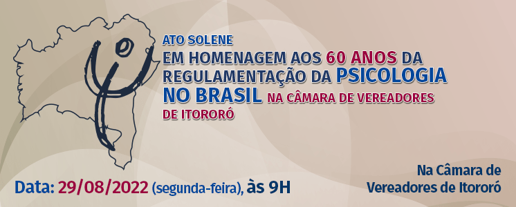 O Conselho Regional de Psicologia da Bahia – 3ª Região (CRP-03) convida toda a categoria e estudantes para participar do ato solene, na Câmara Municipal de Vereadores de Itororó, a ser realizado no dia 29 de agosto deste ano, às 9h. O objetivo da iniciativa é celebrar as contribuições da Psicologia brasileira, considerando os últimos 60 anos.