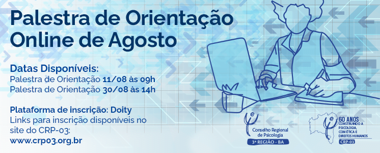 O Conselho Regional de Psicologia da Bahia (CRP-03) disponibilizou o calendário de julho para Palestras de Orientação. A participação é requisito obrigatório na entrega de Carteiras de Identificação Profissional (CIP) para primeira inscrição.