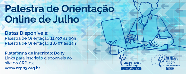 O Conselho Regional de Psicologia da Bahia (CRP-03) disponibilizou o calendário de julho para Palestras de Orientação. A participação é requisito obrigatório na entrega de Carteiras de Identificação Profissional (CIP) para primeira inscrição.