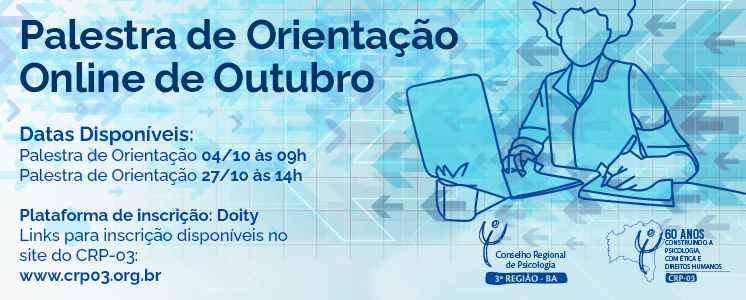 O Conselho Regional de Psicologia da Bahia (CRP-03) disponibilizou o calendário de outubro para Palestras de Orientação. A participação é requisito obrigatório na entrega de Carteiras de Identificação Profissional (CIP) para primeira inscrição.