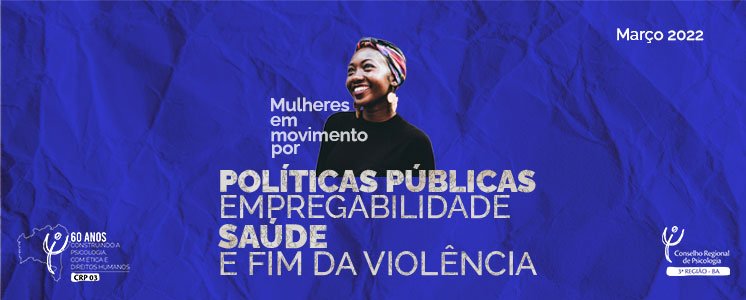 O Conselho Regional de Psicologia da Bahia (CRP-03) realiza, pelo segundo ano consecutivo, a campanha “Mulheres em movimento por políticas públicas, empregabilidade, saúde e fim da violência”.