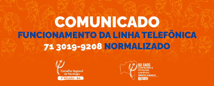O Conselho Regional de Psicologia da Bahia (CRP-03) informa que a linha telefônica 71 3019-9208 já está funcionando regularmente. À exceção deste canal, toda a rede telefônica da sede do CRP-03, em Salvador (BA), estava disponível para comunicação. Somente esta linha precisou de manutenção, realizada ao longo do expediente administrativo entre ontem e parte do dia de hoje (01); agora, volta a integrar a rede.