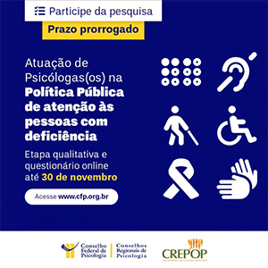 O Conselho Federal de Psicologia (CFP) prorrogou até 30 de novembro o prazo para que as(os) psicólogas(os) manifestem interesse em participar da pesquisa sobre a atuação da categoria na política pública de atenção às pessoas com deficiência.