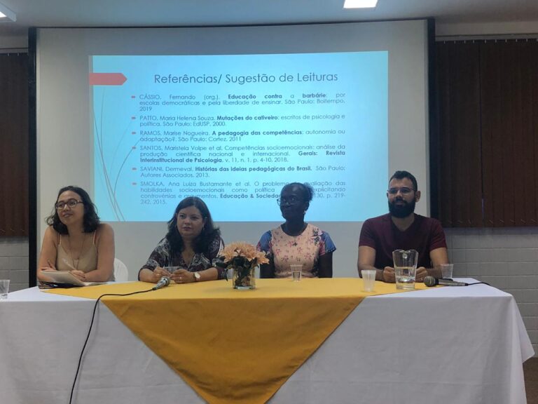 O colóquio contou com as falas de Angelina Pandita Pereira, da psicóloga Cynthia Tanajura (CRP-03/1959), do professor Hélio da Silva Neto e da gestora escolar Cacilda Braga. Cada convidada/o pode falour um pouco sobre as suas pesquisas e vivências em relação ao âmbito escolar e as questões em torno da educação socioemocional.