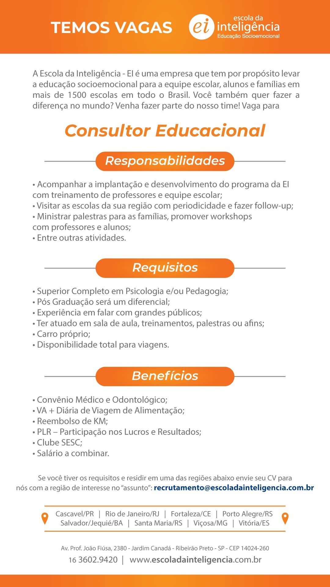 Vaga de Consultor Educacional na Escola de Inteligencia Educação Socioemocional