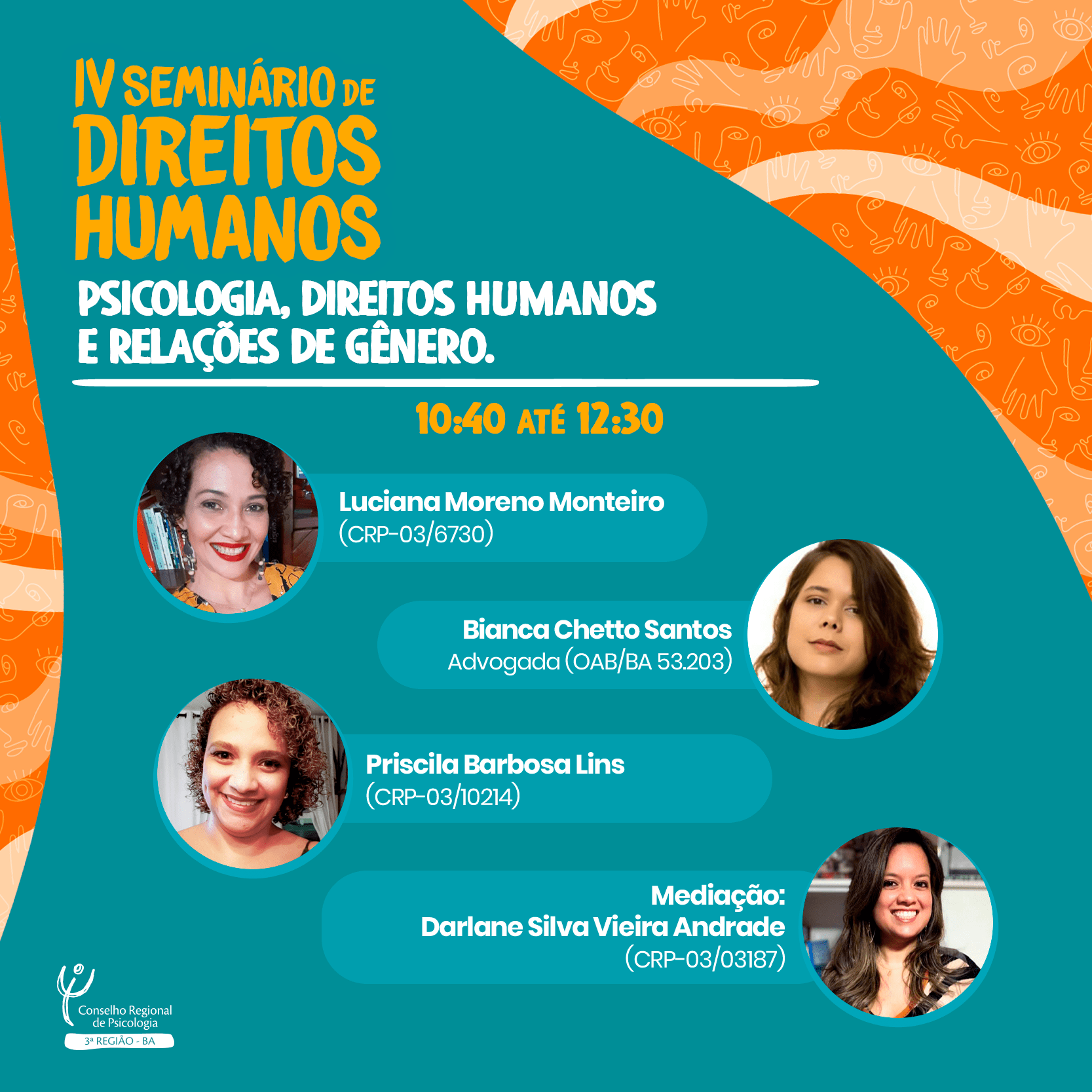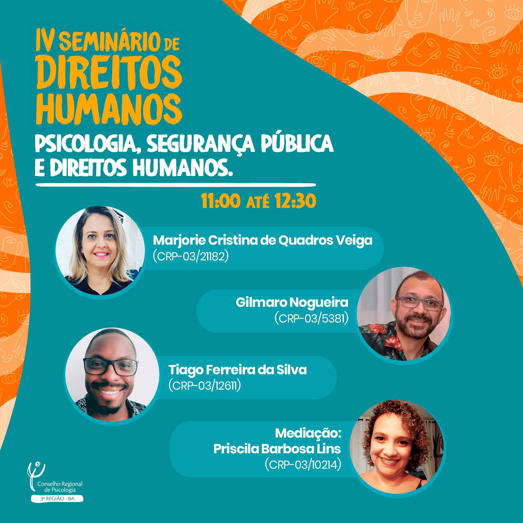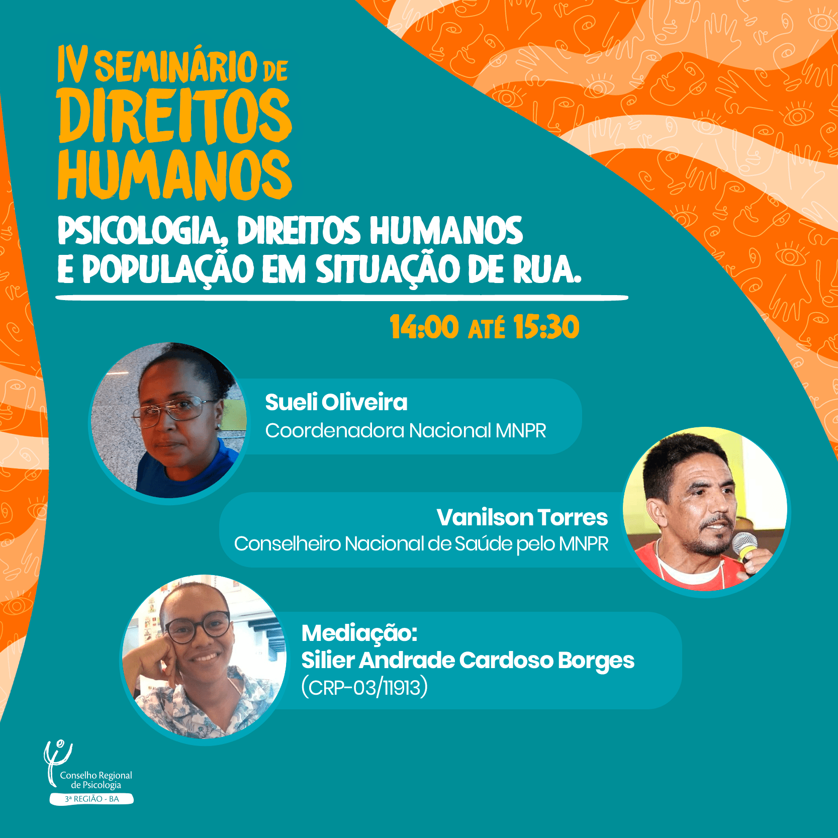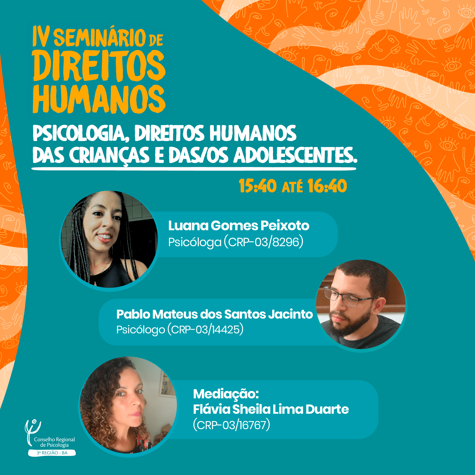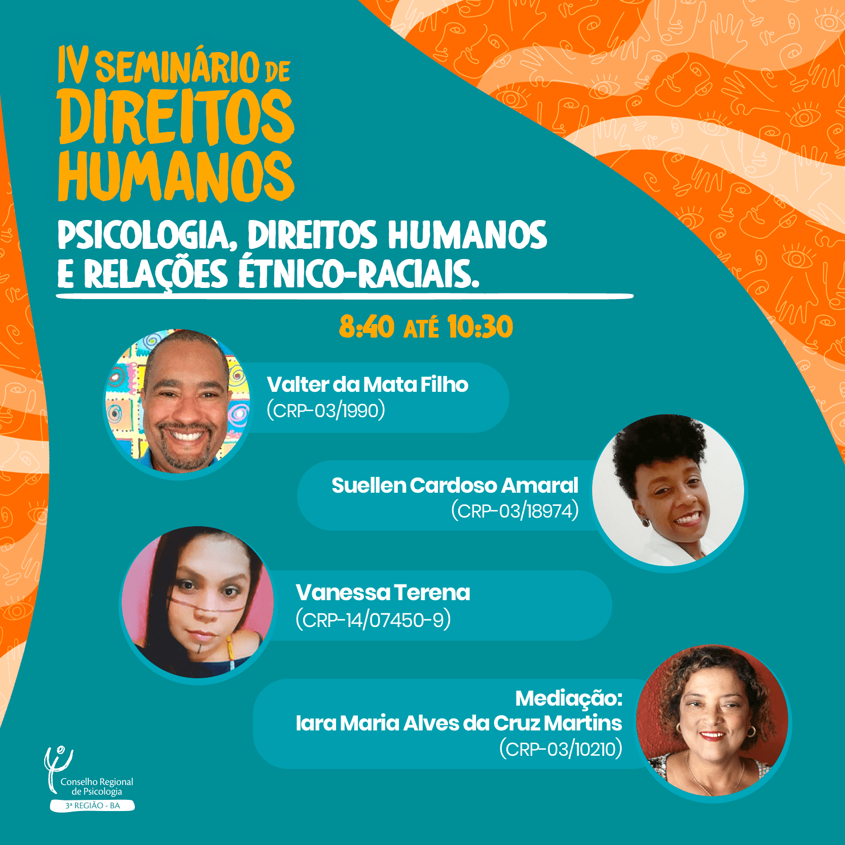 Nos dias 10 e 11 de dezembro deste ano, o Conselho Regional de Psicologia da Bahia, por meio da Comissão de Direitos Humanos (CDH), realiza o IV seminário de Direitos Humanos.