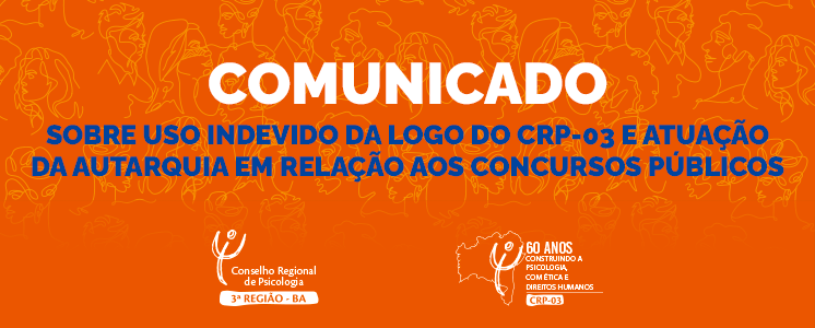 O Conselho Regional de Psicologia da Bahia (CRP-03) comunica a toda categoria de psicólogas e psicólogos que segue atento ao uso da sua logomarca de forma indevida, por parte de alguns perfis nas redes sociais, e informa que irá tomar as medidas cabíveis de acordo com a lei nº 9.279/96. A Autarquia reitera que as notícias da instituição são veiculadas nos canais oficiais do CRP-03, sendo eles: site, comunicação eletrônica, publicações e redes sociais.