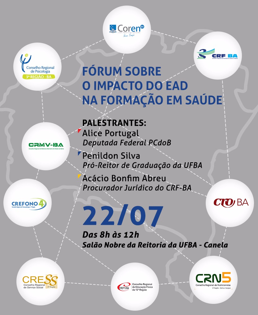 São convidados para conduzir o encontro a deputada federal Alice Portugal, o pró-reitor de graduação da UFBA, Penildo Silva, e o procurador do Conselho Regional de Farmácia, Acácio Abreu. O objetivo é tratar do Ensino a Distância nos cursos de Graduação de Saúde e discutir o impacto que esta modalidade pode trazer para as/os futuras/os profissionais.