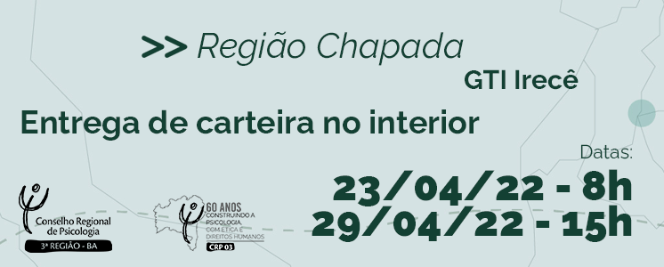 Nos dias 23 e 29 de abril de 2022, o Conselho Regional de Psicologia da Bahia (CRP-03), por meio da Comissão de Interiorização (COMINTER), realizará entrega de Carteira de Identidade Profissional (CIP) na cidade de Irecê.