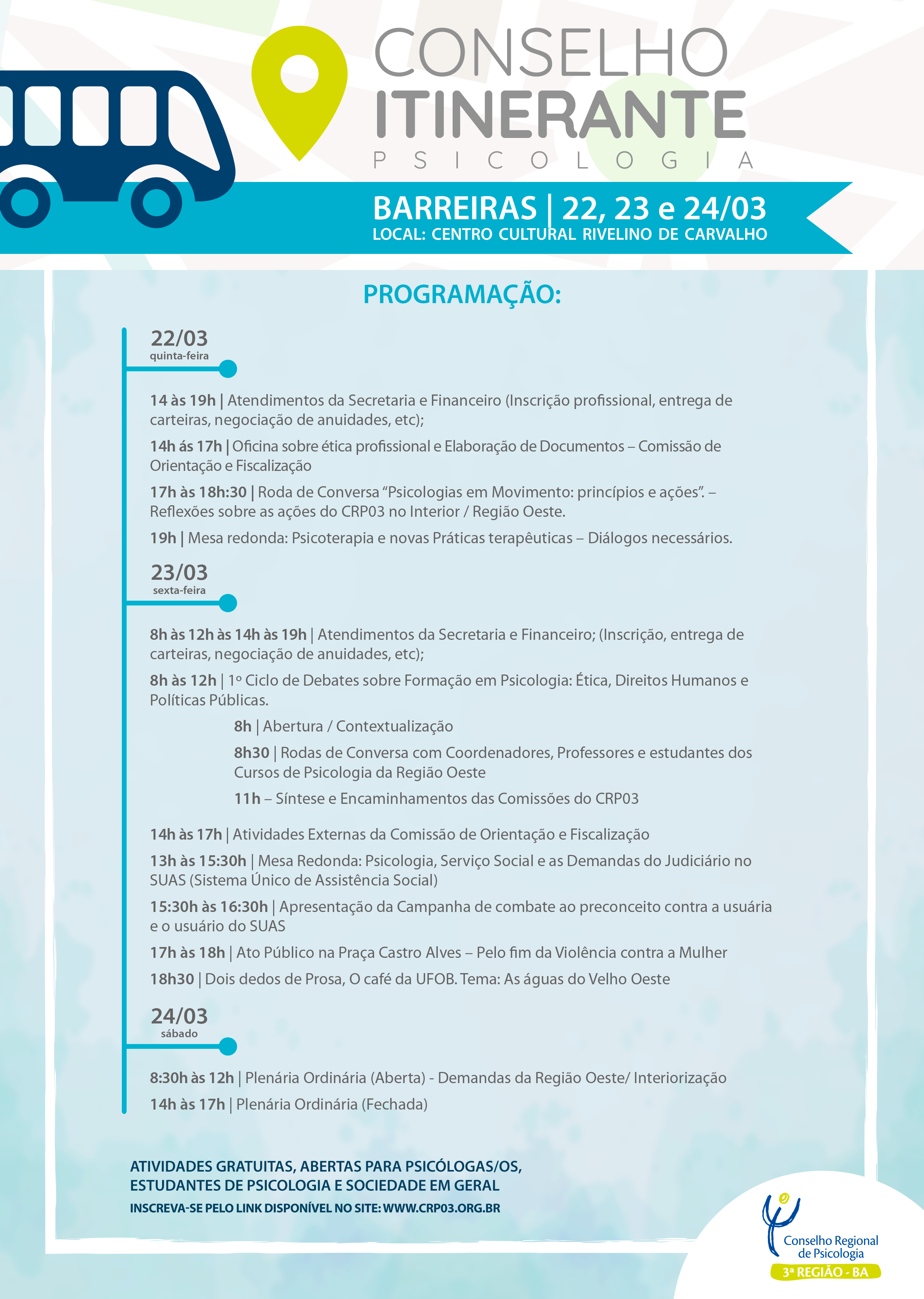 Para seguir com o propósito de interiorizar as ações da autarquia, o Conselho Regional de Psicologia realizará mais uma edição do Conselho Itinerante, desta vez, na cidade de Barreiras. Com o tema “Movimentando as Psicologias no Oeste da Bahia” o evento está marcado para os dias 22, 23 e 24 de março, no Centro Cultural Rivelino Silva de Carvalho.