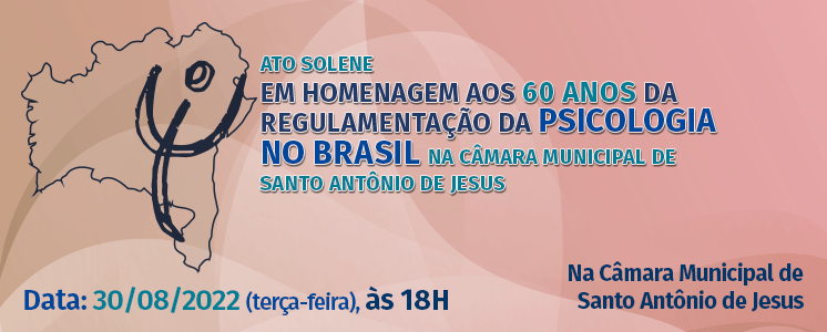 Psicólogas/os e estudantes de Santo Antônio de Jesus e região estão convidadas/os para participar do Ato Solene que será realizado no dia 30 de agosto, às 18h, na Câmara Municipal da cidade. A iniciativa faz parte das comemorações promovidas pelo Conselho Regional de Psicologia da Bahia (CRP-03) para celebrar os 60 anos de regulamentação da Psicologia no Brasil.