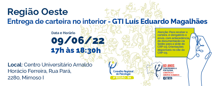 A entrega de Carteira de Identidade Profissional (CIP), na cidade de Luís Eduardo Magalhães será realizada no dia 09 de junho de 2022, às 17h, no Centro Universitário Horácio Ferreira. A atividade é promovida pelo Conselho Regional de Psicologia da Bahia (CRP-03), através da Comissão de Interiorização (COMINTER).