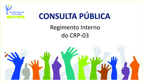 O XIV Plenário do Conselho Regional de Psicologia da Bahia (CRP-03) está realizando uma Consulta Pública para revisão e reestruturação do Regimento Interno da autarquia. Atentas/os à nossa responsabilidade, junto à categoria e sociedade estamos cumprindo mais uma das deliberações do VIII Congresso Nacional de Psicologia realizado em 2013.