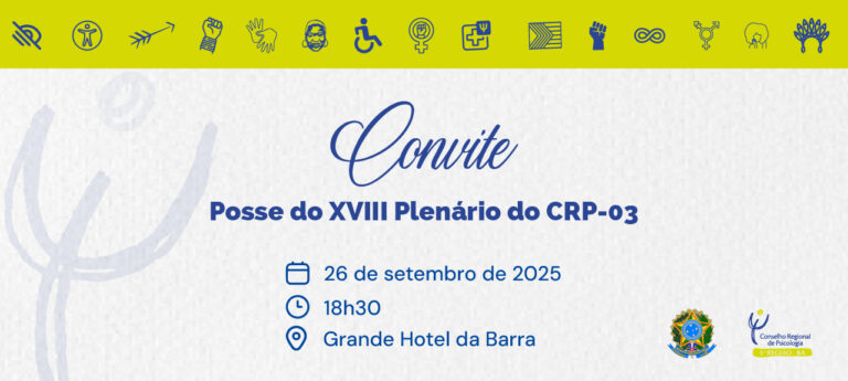 O Conselho Regional de Psicologia da 3ª Região – Bahia (CRP-03) tem a honra de convidar a categoria e sociedade para a cerimônia de posse do XVIII Plenário, composto pelo Coletivo Psicologias em Movimento, eleito democraticamente para o triênio 2025/2028.