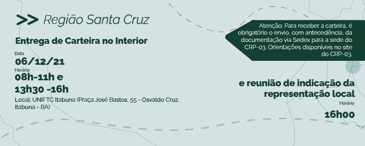 A Comissão de Interiorização do Conselho Regional de Psicologia da Bahia (COMINTER) realizará entrega de Carteira de Identidade Profissional (CIP) e reunião de indicação para representação local em Itabuna. A atividade será no dia 06 de dezembro, na UNIFTC Itabuna.