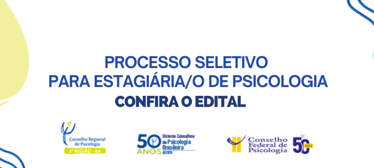 O Conselho Regional de Psicologia da Bahia (CRP-03) realiza processo seletivo para o preenchimento de 01 (uma) vaga de de Estágio em Psicologia em Comissões da autarquia. Para participar, a/o estudante precisa estar matriculada/o na graduação de Psicologia, cursando entre o 8º e 9º semestre.