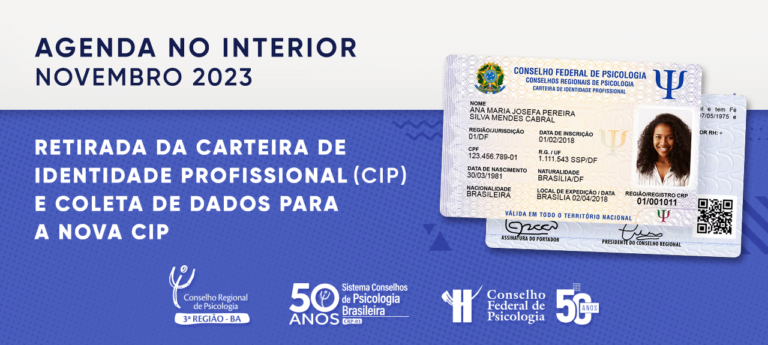 O Conselho Regional de Psicologia da Bahia (CRP-03) anunciou o calendário de entrega de Carteira de Identidade Profissional (CIP) no interior do estado para o mês de novembro. As entregas são organizadas pela Comissão de Interiorização (COMINTER) da autarquia, em parceria com os Grupos de Trabalho de Interiorização (GTIs).