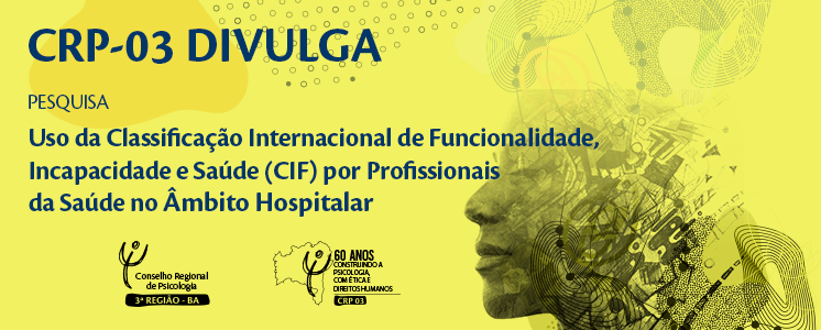 O Conselho Regional de Psicologia da Bahia (CRP-03) divulga que a Pesquisa “Uso da Classificação Internacional de Funcionalidade, Incapacidade e Saúde (CIF) por profissionais da saúde no âmbito hospitalar” está recebendo contribuições por meio de questionário disponível em: https://forms.gle/yXJToFDv2DtE8xRg8.