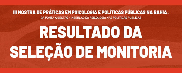 O Conselho Regional de Psicologia da Bahia (CRP-03) divulga o resultado do edital de seleção de monitoras/es para a III Mostra de Práticas em Psicologia e Políticas Públicas na Bahia. Ao todo, 40 estudantes de graduação em Psicologia foram selecionadas/os para monitoria e mais 10 integrarão o cadastro reserva.