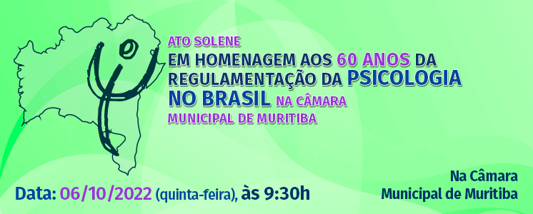O Conselho Regional de Psicologia da Bahia (CRP-03) será representado no ato solene de memória aos 60 anos da regulamentação da Psicologia no Brasil promovido pela Câmara Municipal de Muritiba [Avenida Tancredo Neves, s/n, Centro], Recôncavo da Bahia, que acontece no próximo dia 6 de outubro. Iniciativa do vereador Marco da Liga e da Associação de Psicólogas de Muritiba, o evento reúne representantes políticos e da sociedade civil para destacar as principais contribuições da Psicologia enquanto ciência e prática profissional ao longo das seis últimas décadas e os atuais desafios do campo no Brasil e em Muritiba. As inscrições devem ser feitas previamente pela internet até o dia de realização do ato solene.