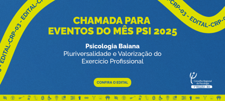 O Conselho Regional de Psicologia da Bahia (CRP-03) publicou o Edital de Chamamento Público para o Mês da Psicologia 2025, cujo tema será “Psicologia Baiana: Pluriversalidade e Valorização do Exercício Profissional”. A proposta busca evidenciar as diversas formas de ser e atuar da Psicologia no estado da Bahia, promovendo ações que fortaleçam o exercício profissional ético, crítico e comprometido com os direitos humanos.