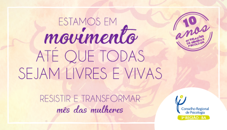 Durante este mês, o Conselho Regional de Psicologia da Bahia (CRP-03) realizará e apoiará ações comemorativas ao 8 de março, Dia Internacional da Mulher. Com a campanha “Estamos em movimento até que todas sejam livres e vivas – resistir e transformar”, o Conselho promoverá ações em Salvador e no interior do estado. Em 2018, as celebrações serão ainda mais especiais por conta do aniversário de 10 anos do Grupo de Trabalho Relações de Gênero e Psicologia.
