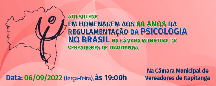O Conselho Regional de Psicologia da Bahia – 3ª Região (CRP-03) convida toda a categoria e estudantes para participar do ato solene, na Câmara Municipal de Vereadores de Itapitanga, a ser realizado no dia 06 de setembro de 2022, às 19h. O objetivo da iniciativa é celebrar as contribuições da Psicologia nos 60 anos de regulamentação.