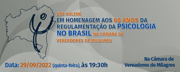 O Conselho Regional de Psicologia da Bahia – 3ª Região (CRP-03) convida toda a categoria e estudantes para participar do ato solene, em Milagres, a ser realizado no dia 29 de setembro, às 19h30, na Câmara de Vereadores da cidade.