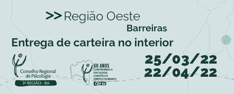 Nos dias 25/03 e 22/04/2022, o Conselho Regional de Psicologia da Bahia (CRP-03), por meio da Comissão de Interiorização (COMINTER), realizará entrega de Carteira de Identidade Profissional (CIP) em Barreiras.