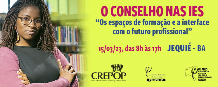 No mês de março, o Conselho Regional de Psicologia da Bahia (CRP-03) realizará mais uma edição da atividade “O Conselho nas IES: os espaços de formação e a interface com o futuro profissional”. O evento acontecerá no dia 15 de março, das 9h às 17h, no Módulo 3 da FTC Jequié. Com organização do Centro de Referências Técnicas em Psicologia e Políticas Públicas (CREPOP) e da Comissão de Orientação e Fiscalização (COF), o encontro tem o apoio da Comissão de Interiorização (COMINTER), da Comissão de Formação (COMFORM) e da Comissão de Políticas Públicas (CPP). As inscrições são gratuitas e as/os participantes terão direito ao certificado.