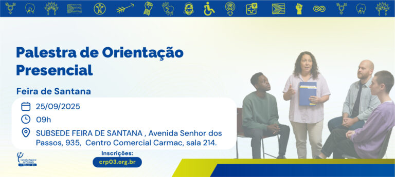 No dia 25/09 (quinta-feira), às 9h, acontece a Palestra de Orientação Presencial em Feira de Santana, na Subsede do Conselho Regional de Psicologia Bahia (CRP-03). A participação é um requisito obrigatório para o recebimento da Carteira de Identificação Profissional (CIP) de primeira inscrição.