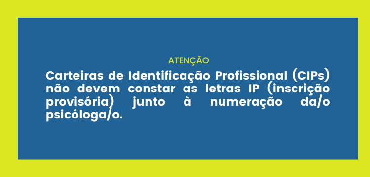 O Conselho Regional de Psicologia da Bahia (CRP-03), desde o dia 03 de dezembro 2018, publicou em seus canais de comunicação a adequação das Carteiras de Identificação Profissional (CIPs), informando que no documento não devem constar mais as letras IP (inscrição provisória) junto à numeração da/o psicóloga/o.
