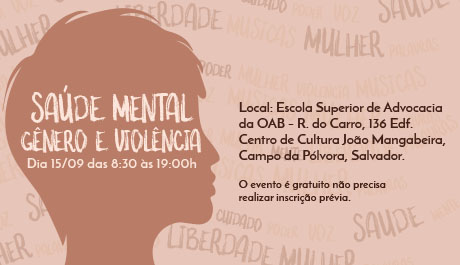 Um encontro sobre saúde mental, gênero e violência será realizado no dia 15, às 8h30, na Escola Superior de Advocacia da OAB. A discussão interdisciplinar é organizada pelo Conselho Regional de Psicologia, juntamente com a Rede de Enfrentamento à Violência Contra a Mulher. A atividade tem a colaboração da Ordem dos Advogados Seção Bahia (OAB-BA), do Conselho Regional de Serviço Social da 5ª Região – Bahia (CRESS-BA), do Conselho Regional de Medicina do Estado da Bahia (CREMEB), do Conselho Regional de Fisioterapia e Terapia Ocupacionalda, do Núcleo de Estudos Interdisciplinares sobre a Mulher – NEIM, e da Rede Dandaras.