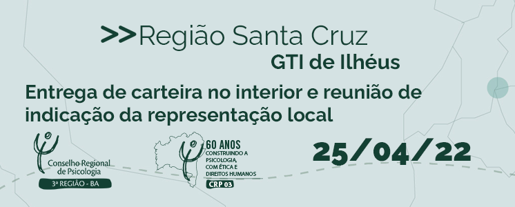 No dia 25 de abril de 2022, a Comissão de Interiorização do Conselho Regional de Psicologia da Bahia (COMINTER) realizará entrega de Carteira de Identidade Profissional (CIP) e reunião de indicação para representação em Ilhéus. A atividade será realizada na Faculdade de Ilhéus (Sala T07) . Endereço: Rod. Ilhéus | Olivença – São Francisco, Ilhéus – BA.