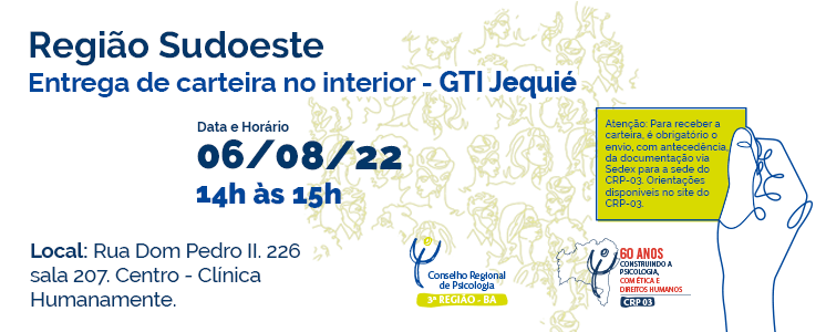 A Comissão de Interiorização (COMINTER) do Conselho Regional de Psicologia da Bahia (CRP-03) realizará mais uma entrega de Carteira de Identidade Profissional (CIP) no interior. A atividade será em Jequié, no dia 06 de agosto, das 14h às 15h, Rua Dom Pedro II. 226 sala 207. Centro – Clínica Humanamente.