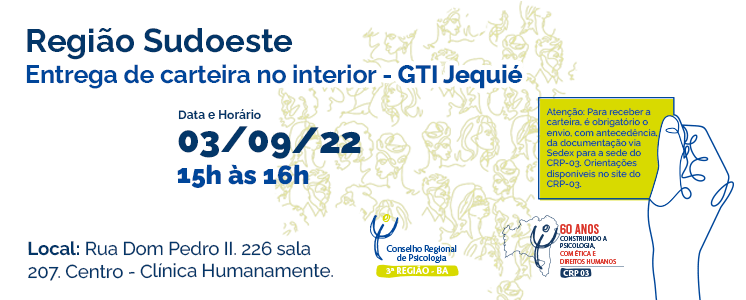 A Comissão de Interiorização (COMINTER) do Conselho Regional de Psicologia da Bahia (CRP-03), realizará mais uma entrega de Carteira de Identidade Profissional (CIP) no interior. A atividade será em Jequié, no dia 03 setembro, das 15h às 16h, Rua Dom Pedro II. 226 sala 207. Centro – Clínica Humanamente.