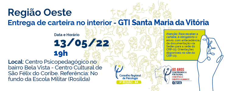 A Comissão de Interiorização (COMINTER) do Conselho Regional de Psicologia da Bahia (CRP-03) realizará mais uma entrega de Carteira de Identidade Profissional (CIP) no interior. A atividade será no dia 13 de maio, às 19h, no Centro Psicopedagógico, bairro Bela Vista – Centro Cultural de São Félix do Coribe, em Santa Maria da Vitória.