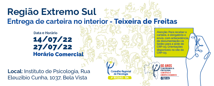 Nos dias 14 e 27 de julho, a Comissão de Interiorização (COMINTER) do Conselho Regional de Psicologia da Bahia (CRP-03) realizará mais uma entrega de Carteira de Identidade Profissional (CIP) no interior. A atividade será em Teixeira de Freitas, em horário comercial, no Instituto de Psicologia, Rua Eleuzíbio Cunha, 1037, Bela Vista.