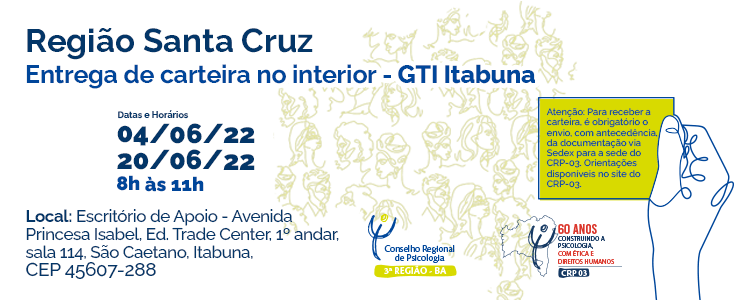 O Conselho Regional de Psicologia da Bahia (CRP-03), por meio da Comissão de Interiorização (COMINTER), realizará em junho, a entrega de Carteira de Identidade Profissional (CIP) em Itabuna.