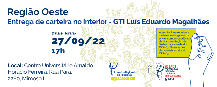 A Comissão de Interiorização (COMINTER) do Conselho Regional de Psicologia da Bahia (CRP-03) realizará mais uma entrega de Carteira de Identidade Profissional (CIP) no interior. A atividade será em Luís Eduardo Magalhães, no dia 27 de setembro, às 17h, no Centro Universitário Arnaldo Horácio Ferreira. Rua Pará, 2280 Mimoso I.