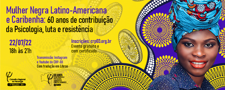No dia 22/07 (sexta-feira), das 18h às 21h, ocorre o evento “Mulher Negra Latino-Americana e Caribenha: 60 anos de contribuição da Psicologia, luta e resistência”. A mesa redonda acontecerá de forma online com transmissão no Youtube do CRP-03. Haverá tradução em Libras certificado para as/os participantes. Inscrições em: https://doity.com.br/mulher-negra-latino-americana-e-caribenha-60-anos-de-contribuicao-da-psicologia-luta-e-resistencia#registration