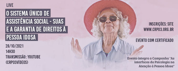 A atividade será realizada às 14h30, com transmissão no Canal do Youtube do CRP-03 (crp03vídeos). Interessadas/os em receber certificação de participação, devem se inscrever em: https://doity.com.br/o-suas-e-a-garantia-de-direitos-da-pessoa-idosa/inscricao